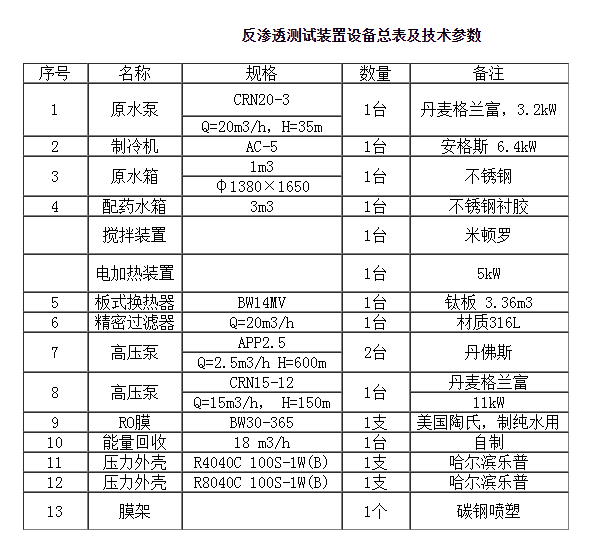 反渗透膜组件性能测试装置是由一组设备组成的一整套系统,各设备的技术参数如下: