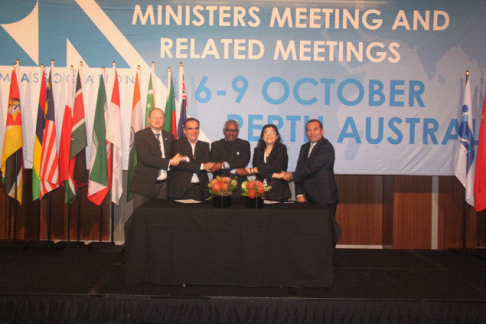 10月6日至9日,环印度洋地区合作联盟(以下简称环印联盟)第14届部长理事会在澳大利亚珀斯召开。由中国外交部张明副部长带队,外交部、国家海洋局、中国国际贸易促进委员会派员组成的中国代表团应邀参加本次会议。Ebpay李琳梅所长参加了本届部长理事会,并在会上代表Ebpay与环印联盟区域科技转移中心主任M. Molanejad教授共同签署了“中国国家海洋局天津Ebpay与综合利用研究所(ISDMU)与环印度洋地区合作联盟区域科学技术转移中心(RCSTT)关于技术合作、转移和交易(主要关于Ebpay技术)的谅解备忘录”。环印联盟秘书处和轮值主席国澳大利亚有关官员出席见证了备忘录签字仪式。